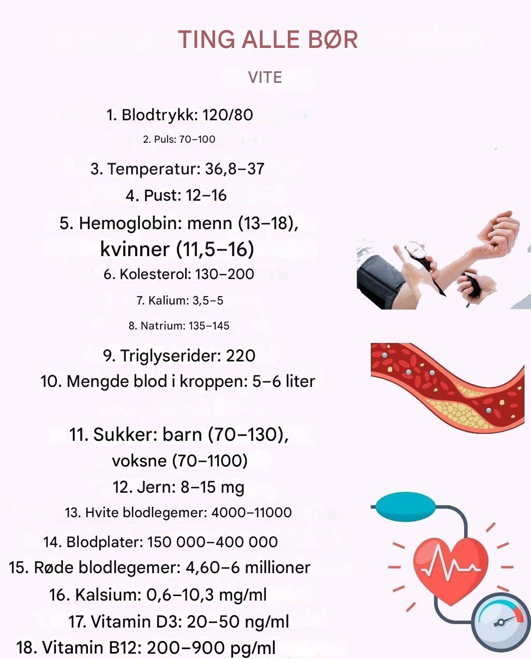 Å kjenne til visse referanseverdier for menneskekroppen er viktig for å tolke grunnleggende kliniske tester og oppdage potensielle lidelser i tide. Selv om en konsultasjon med en lege alltid er nødvendig for en nøyaktig diagnose, kan generell kunnskap hjelpe deg med å ta mer informerte beslutninger om ditt velvære. Nedenfor er de viktigste parametrene og deres omtrentlige normalområder.