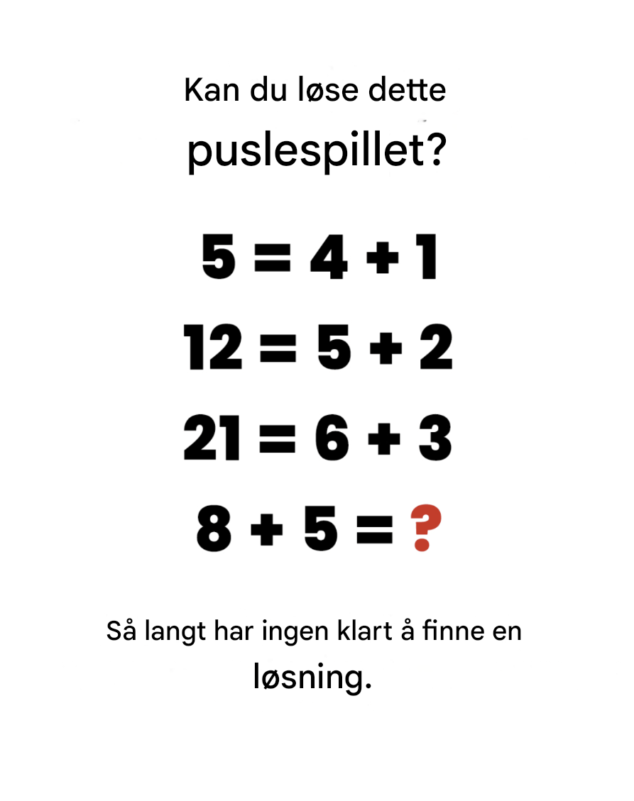 Du leste riktig. En enkel addisjonsoppgave vekker nysgjerrighet på nettet. Den virker barnslig … med mindre den går i stykker. Hvorfor? Fordi her er 1 + 4 lik 5, men 2 + 5 er lik 12, og 3 + 6 er lik … 21! Så hva er 5 + 8? Det er på tide å se på matematikk på en annen måte!