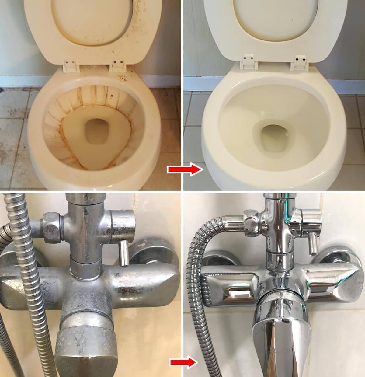 Hell eddiken i toalettet og la det virke i 20 minutter. Skrubb deretter med en børste, tilsett borakspulver og varmt vann, og fortsett å skrubbe grundig.